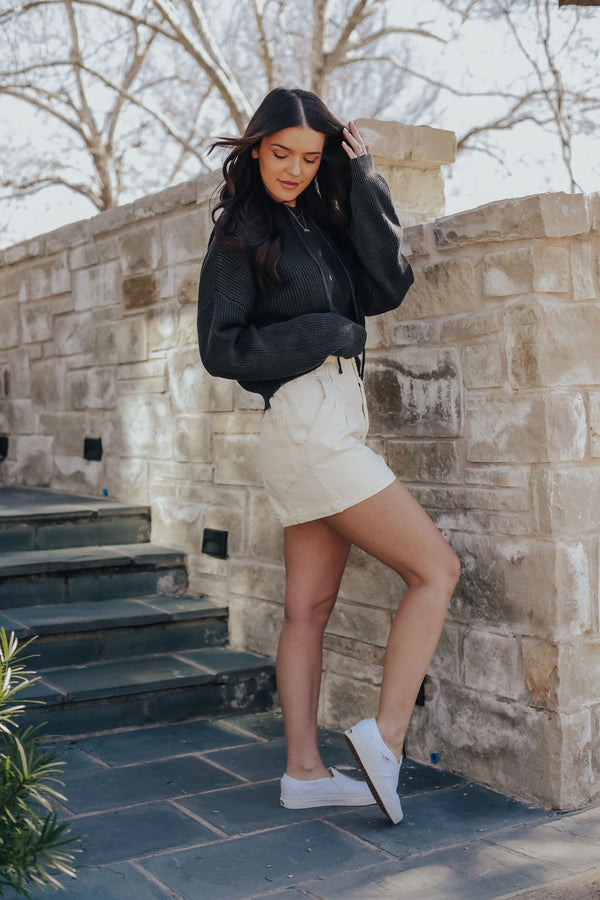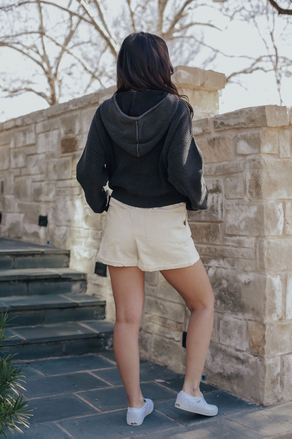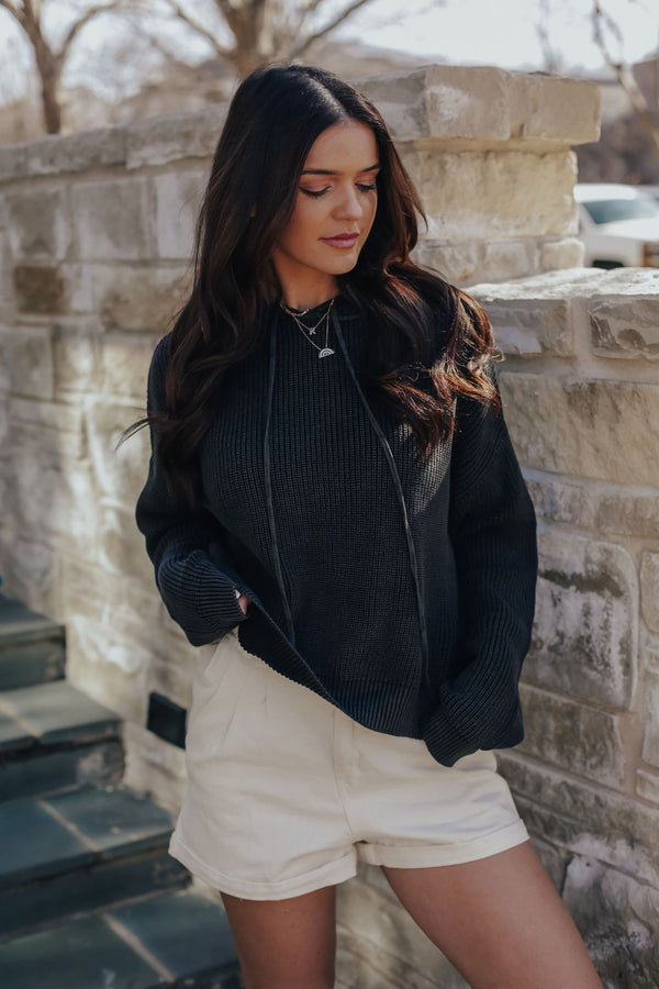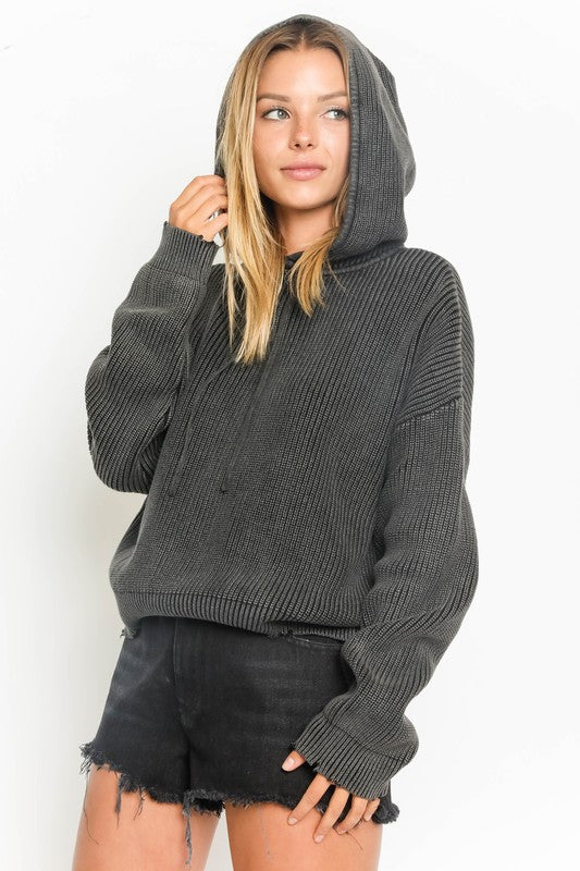 Charcoal Wash SweaterOur Charcoal Washed Sweater features a hooded neck and drawstrings.Knit.Model's Measurements:Height 5'7 | Bust 32 | Waist 24 | Hips 34 | Size SFabric100% Cotton
