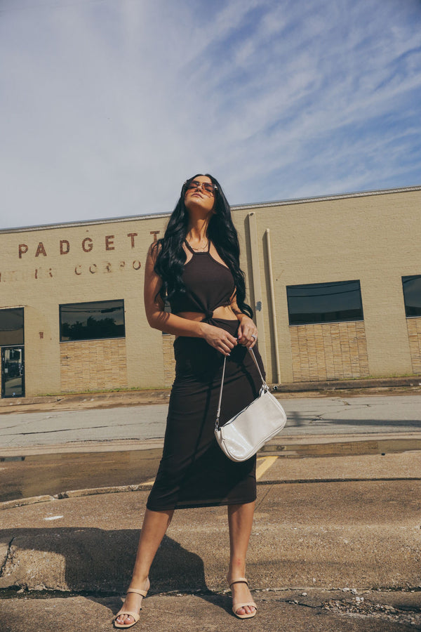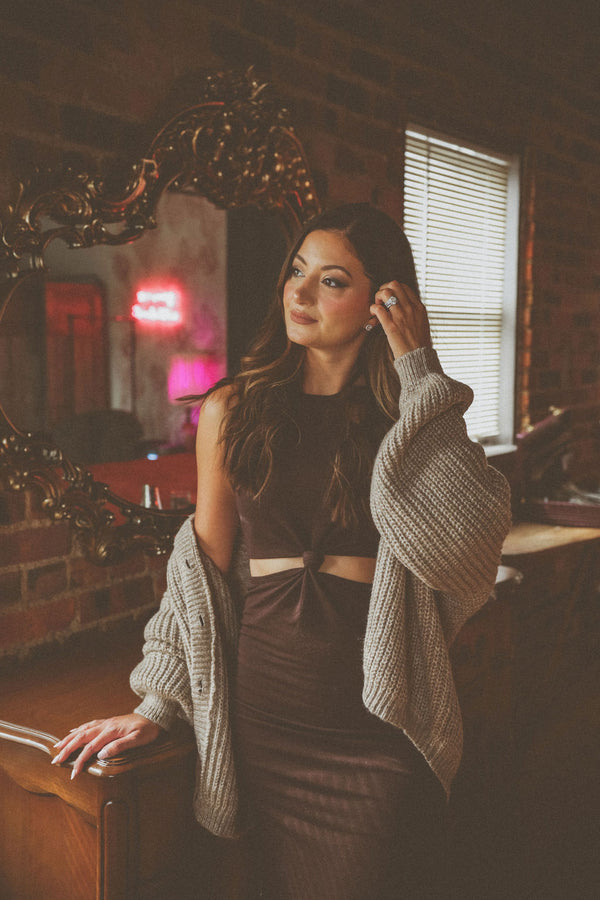 Cut Out Halter Midi Dress.Raven is wearing a size SMALL