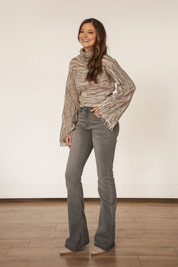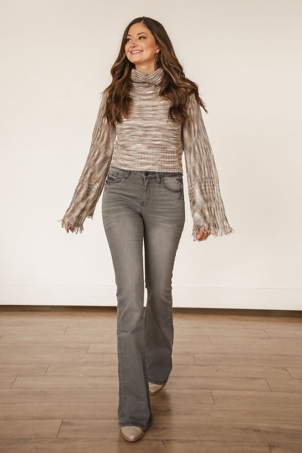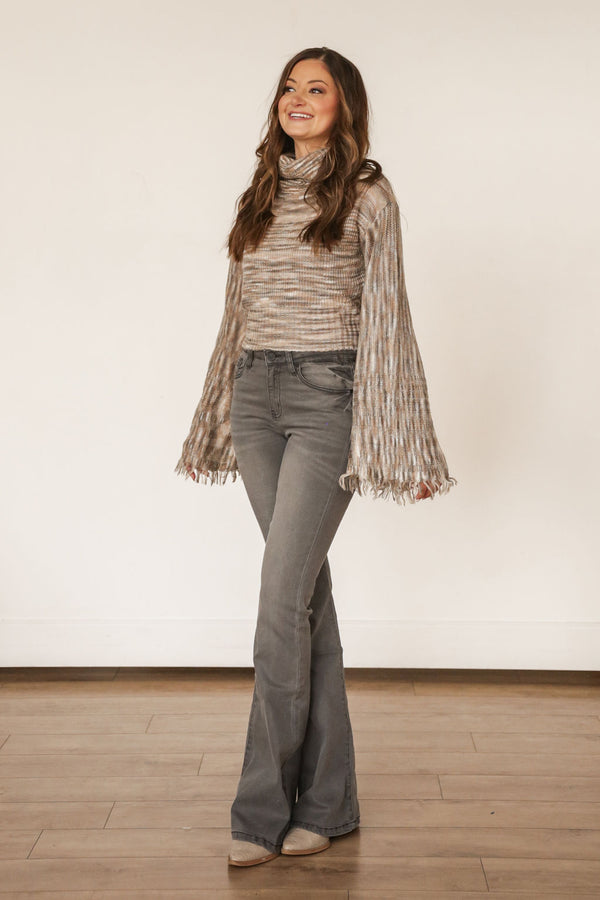 Knit Fringe Sweater Our Multi Knit Turtleneck Sweater features fringe trims and bell sleeves.Knit.Model's Measurements:Height 5'9 | Bust 32 | Waist 24 | Hips 34 | Size SFabric100% Acrylic