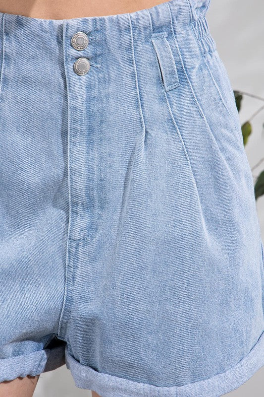 High-waisted with paper bag denim shorts * Waistband with elastic at back * Pleat detail at front * Folded hem