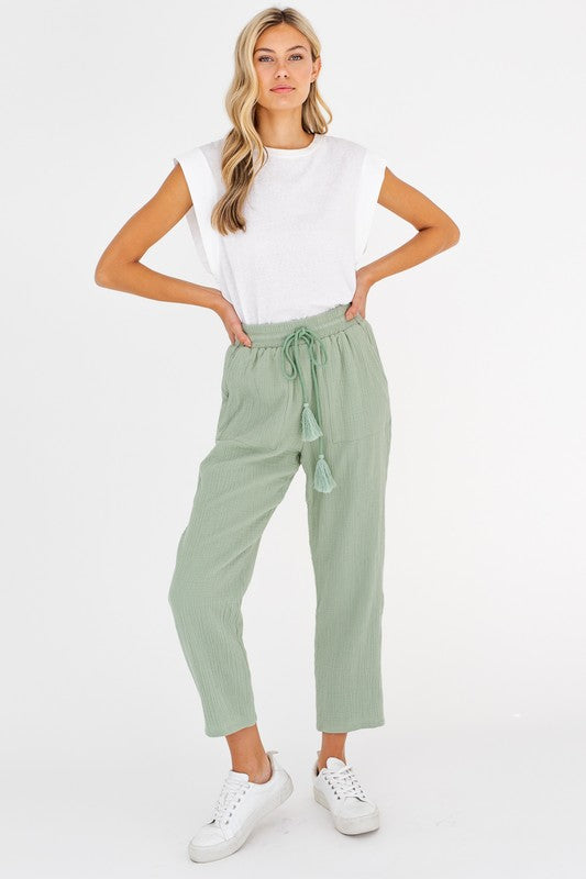 Tassle Waist Tie PantModel is wearing a size SmallModel Specs:Height: 5'9"Dress Size: 2Bust: 32"Waist: 24"Hip: 35"Fabric100% Cotton